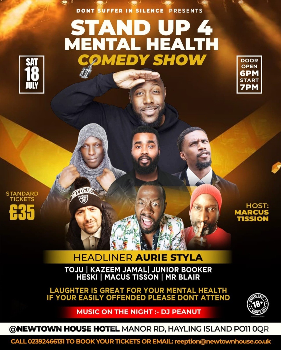 Hosted by the great Marcus Tisson. STAND UP4 MENTAL HEALTH COMEDY SHOW. HEADLINER , THE AWARD-WINNER COMEDIAN AURIE STYLA! Also on the line-up :- TOJU – KAZEEM JAMAL – JUNIOR BOOKER – HESKI – MARCUSS TISSON – MR BLAIR. After Party until midnight with DJ Peanut. £35 per person this includes a welcome glass of fizz to kick start the party! Call 02392 466131 to book your tickets. Take advantage of our special B&B rates if you have tickets to our events.